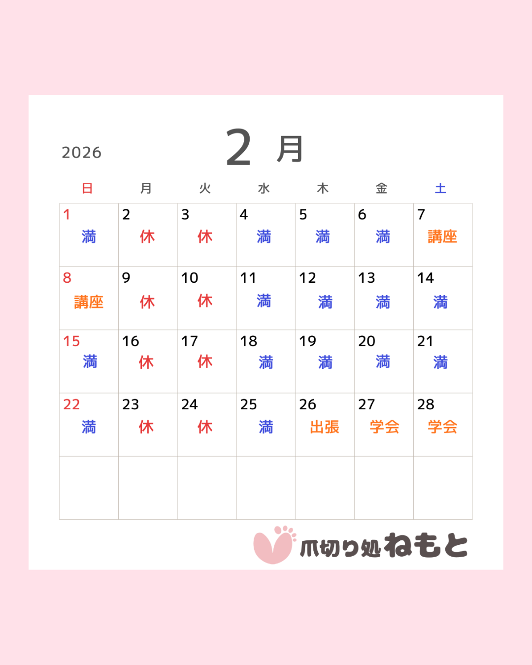 2月の営業のお知らせ 2026 1/30 News 2026年1月30日 こんにちは。爪切り処ねもとです。 2月の営業のお知らせです。 2月は満枠のため、定期ケアでご利用のお客様は3月以降のご予約をお願い致します🙏 また、現状、定期ケアのお客様で予約枠が埋まっている状況のため、新規のお客様の受け入れを一時中断させて頂きます。 緊急の方はご相談くださいませ。 ご迷惑をおかけいたしますが、何卒よろしくお願い致します🥰 News
