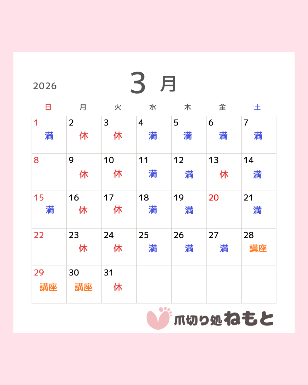 3月の営業のお知らせ 2026 2/27 News 2026年2月27日 こんにちは。爪切り処ねもとです。 3月の営業予定のお知らせです。 現在、新規の方の受け入れを引き続き中断させて頂いており、ご迷惑をおかけします。 どうぞよろしくお願い致します🥰 News